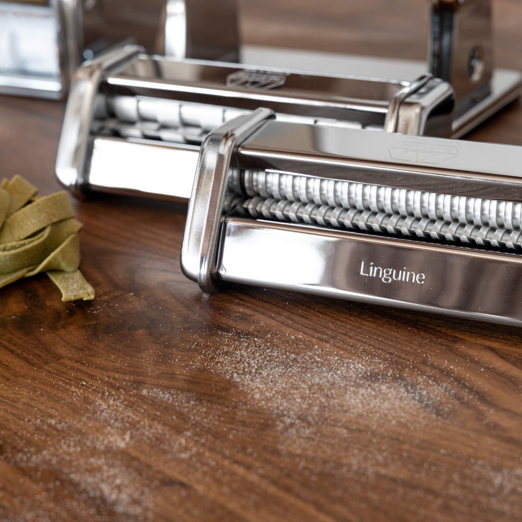 The redesigned rollers use a rounded cavity that produces fully cylindrical spaghetti at thickness settings 3–4, and flat, square tagliolini at settings 8–9.